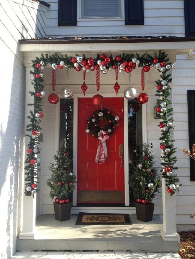 Magical holiday vibes burst from this charming porch, where glistening red and silver ornaments sway softly against crisp white walls.