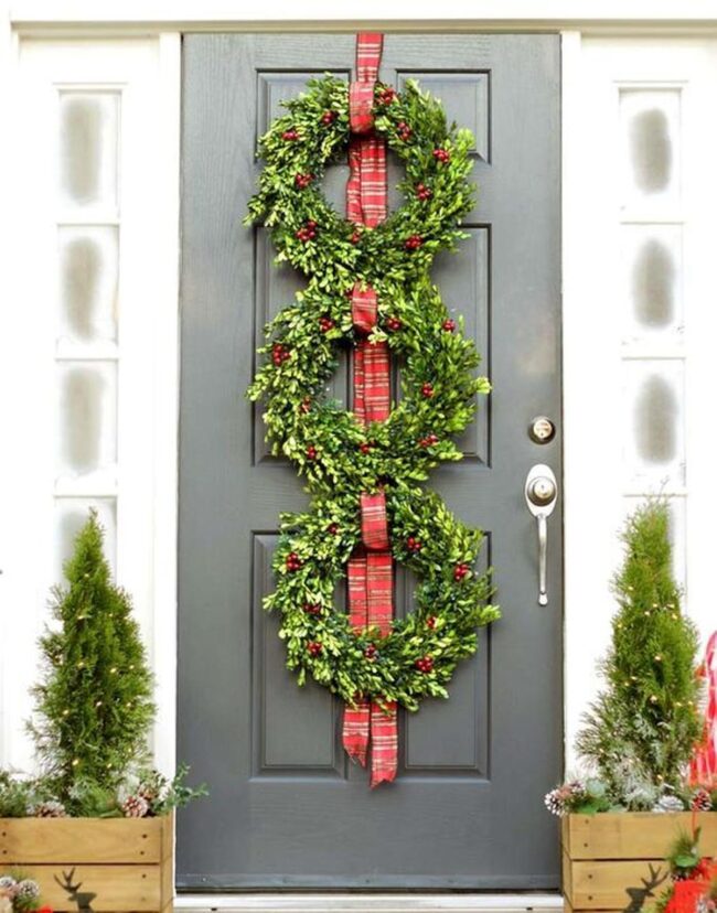 Connecting green wreaths with playful red plaid ribbons creates vertical visual interest that draws eyes upward and sparks cheerful holiday vibes.