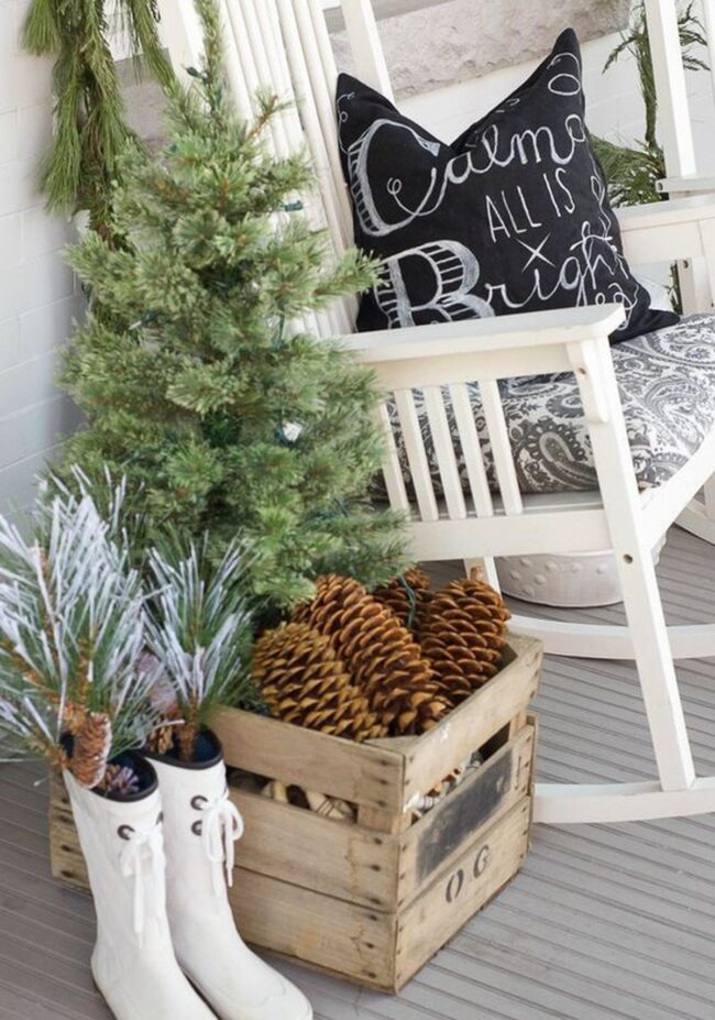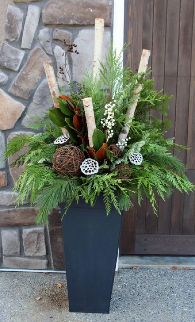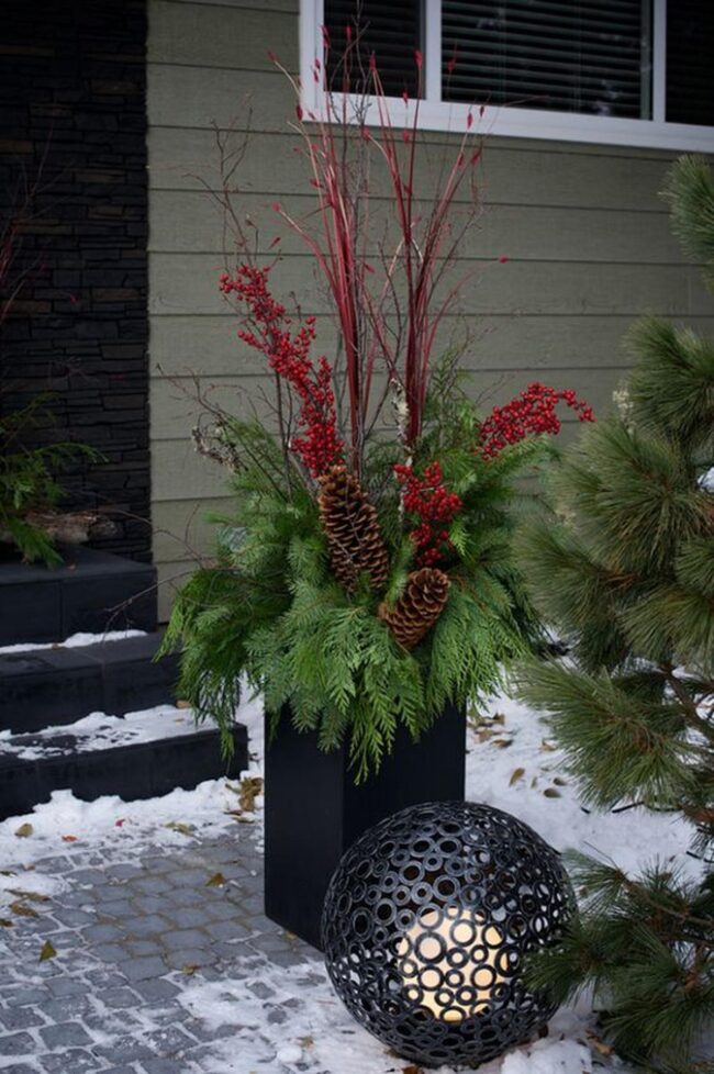 Holiday magic springs to life through pine branches bursting from a sleek black planter, instantly reinventing your porch into a welcoming winter canvas.
