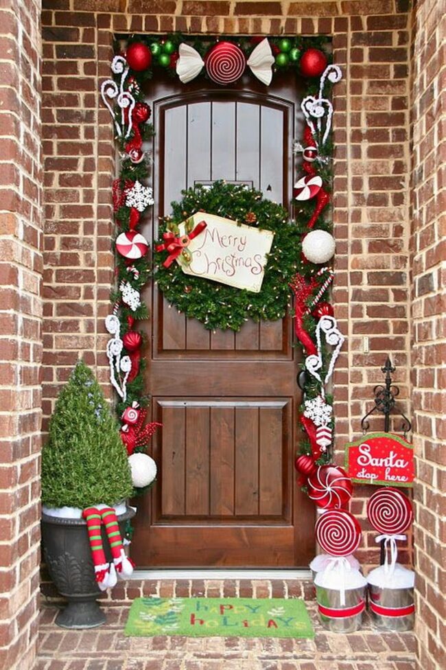 Holiday magic sparkles through a wooden door dressed in whimsical candy-inspired decorations that instantly draw your eye and make you smile.