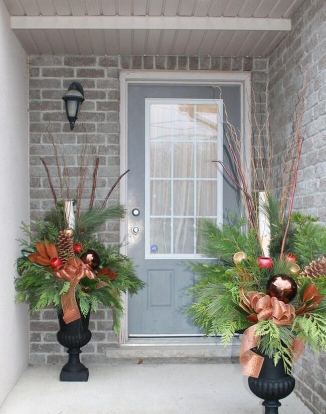 Flanking your doorway, small potted pine trees release their refreshing scent into the crisp winter atmosphere.