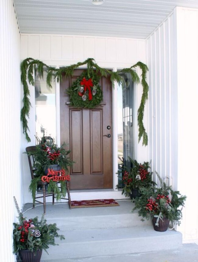 Wooden plankers framing evergreens on both door sides balance natural elements and architectural charm, while crisp white trim makes every decorative detail shine brilliantly.