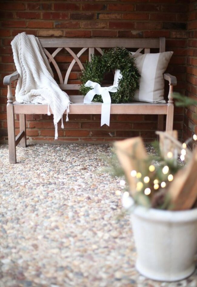 Soft evergreen branches spread across the bench bring fresh forest scents directly to your doorstep, making your entrance feel like an enchanting outdoor sanctuary that welcomes everyone with pure winter magic.