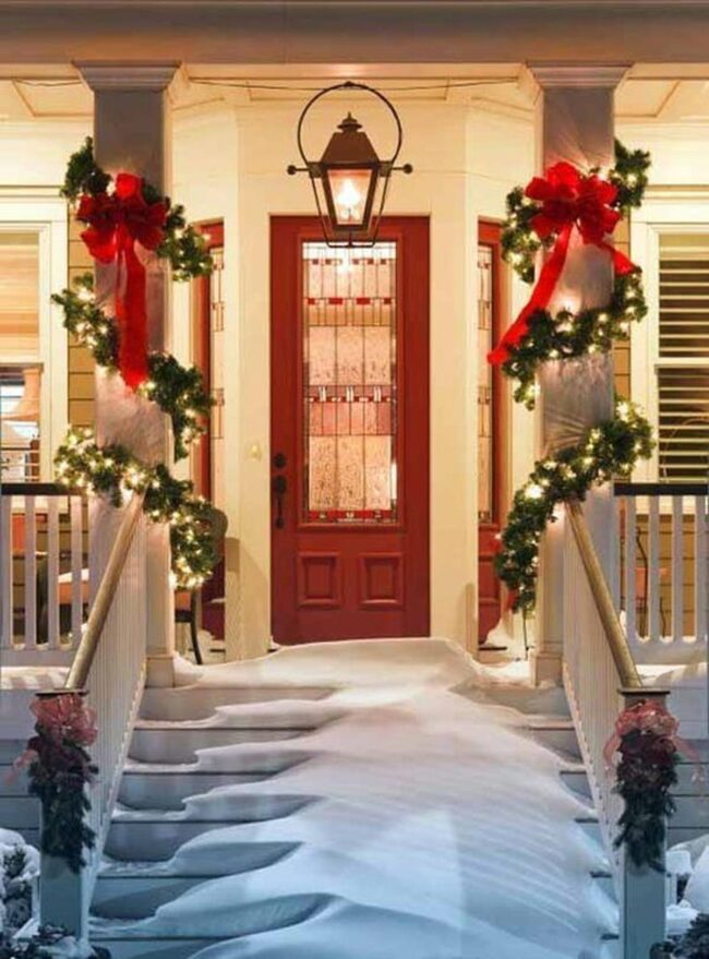 Winter magic sparkles through this enchanting home entrance, where lush green garlands wrap white columns and playful red bows describe immediate attention.