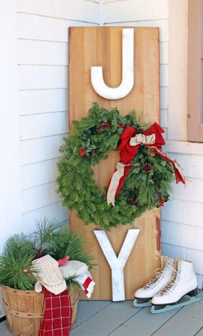 Charming holiday corners burst with personality when you blend unexpected elements like wooden "JOY" letters paired with a berry-adorned green wreath.