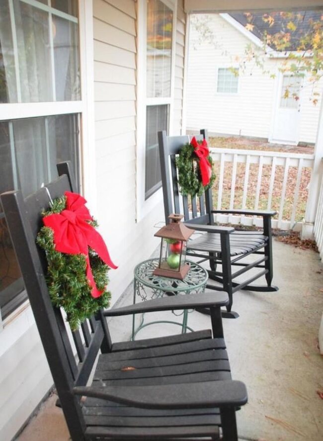 Welcoming black rocking chairs instantly grab attention with cheerful green wreaths and festive red bows cascading down their backs, creating an instant connection to seasonal cheer.