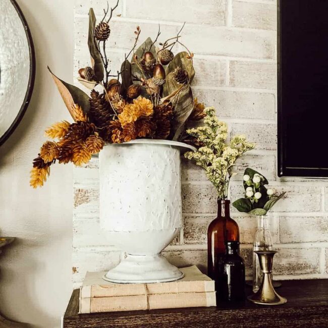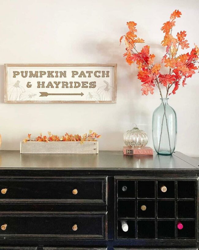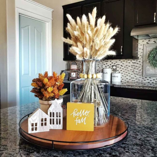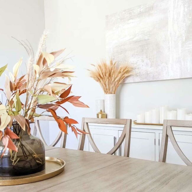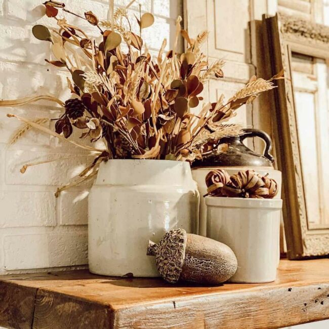 Natural elements like wheat-filled vases and autumn leaves add organic texture and depth.