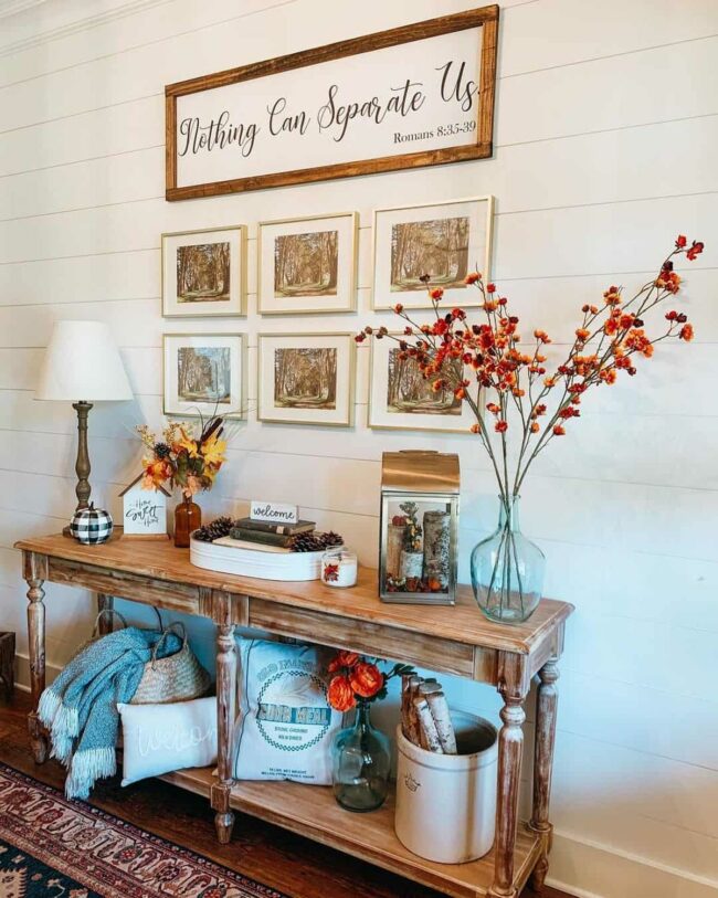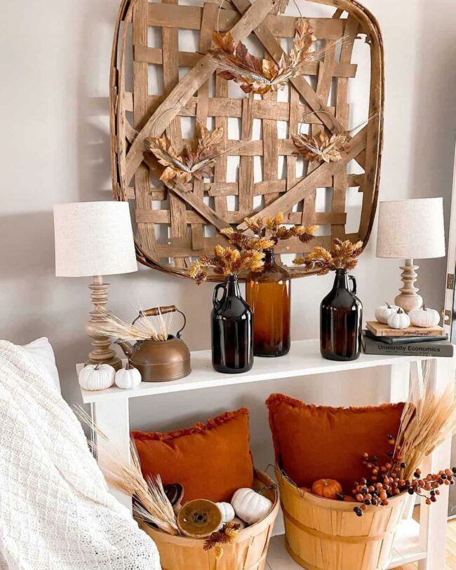 Harvest-inspired decor radiates warmth and charm in any room, with a large tobacco basket commanding attention above a white console table.