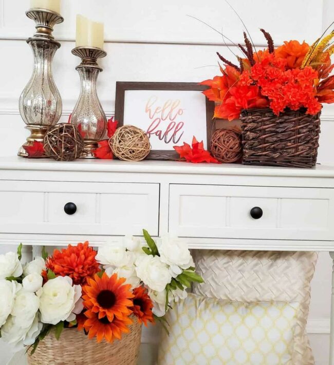White console tables radiate modern charm, especially when paired with warm orange and natural wood elements that capture autumn's essence.