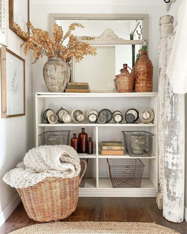 Antique treasures like vintage books, wire baskets, and nostalgic alarm clocks can dramatically uplift these overlooked spaces.