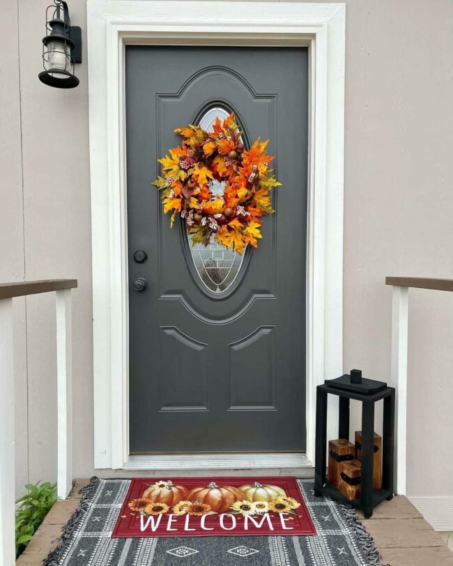 Warm hues cascade through carefully layered entrance mats, creating an inviting path that celebrates seasonal charm.