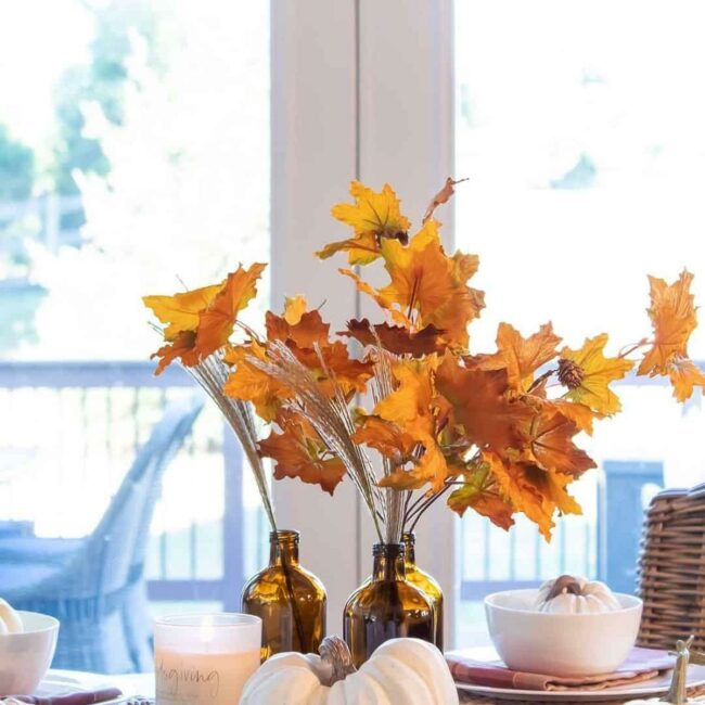 White vases filled with rich orange leaves create striking visual contrast against dark wood tones.