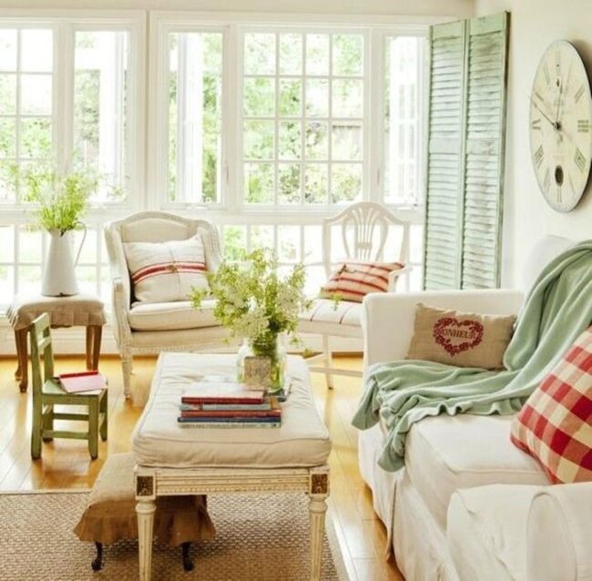 Charming vintage accents like an antique clock and weathered shutters whisper stories of bygone eras, infusing the space with distinctive character.