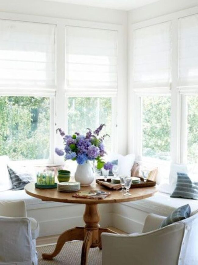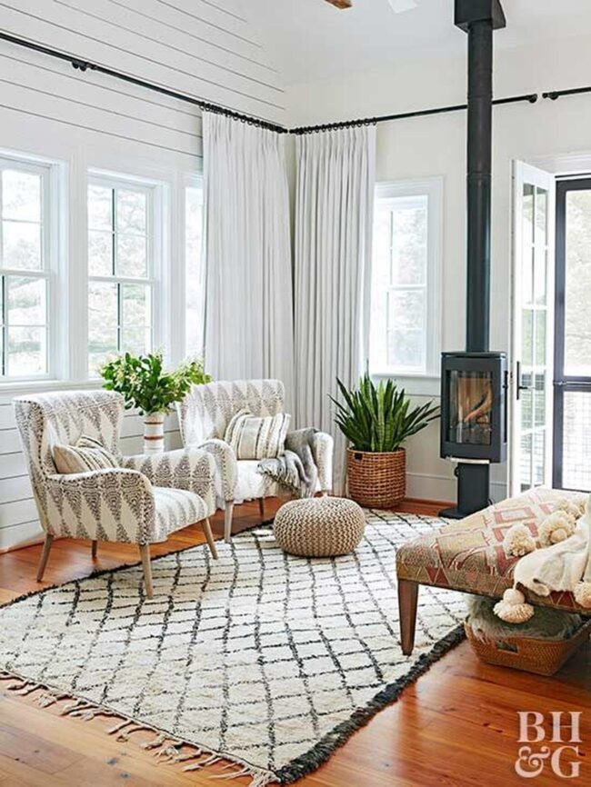 Soft white curtains paired with bamboo shades create a delightful balance between privacy and brightness that feels instantly welcoming.
