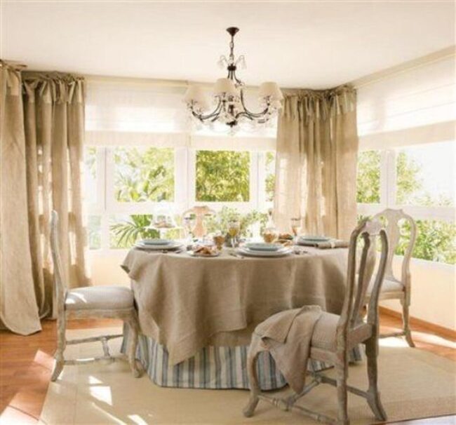 Soft beige linens drape across the table and windows, creating a harmonious connection that feels intentionally curated yet effortlessly comfortable.