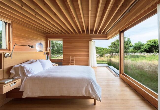 Wooden floors and ceilings set a stunning stage for bedrooms that whisper calm sophistication, where checkered bedding nestles on low beds beside expansive glass walls revealing lush garden scenes.