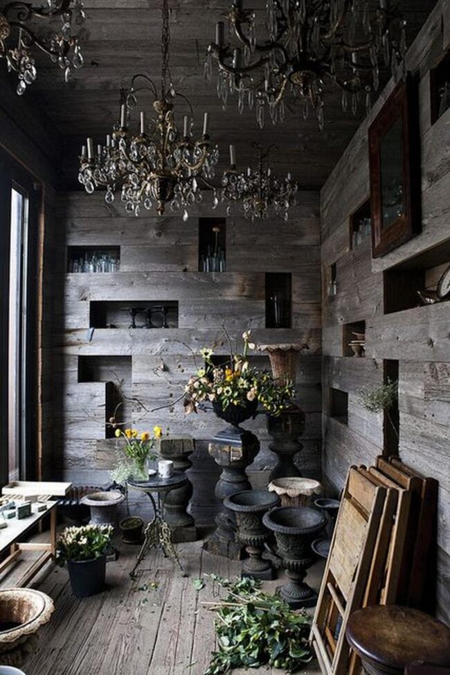 Weathered wooden surfaces blend seamlessly with delicate crystal accents, creating a space where industrial meets soft and inviting.