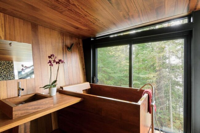 Nature whispers comfort through every corner of this stunning bathroom, where wooden walls wrap you in a soft, forest-like embrace.
