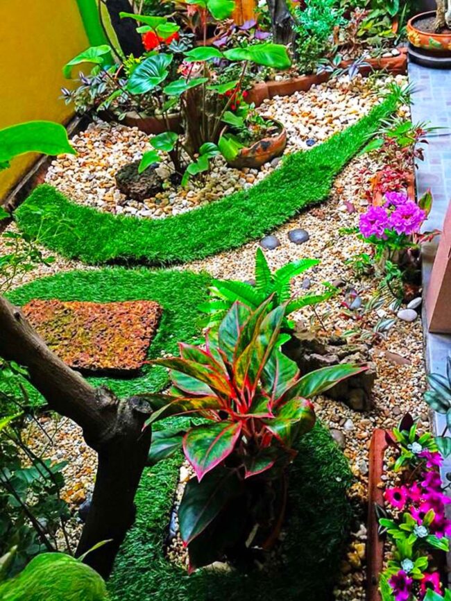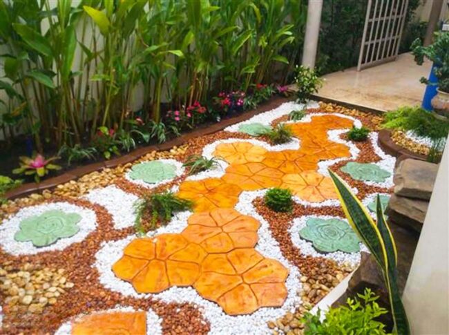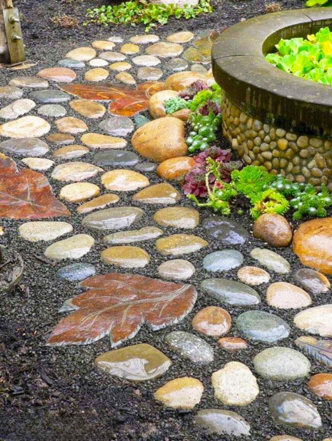 Garden paths become breathtaking artworks when crafted with multicolored stones and delicate greenery.