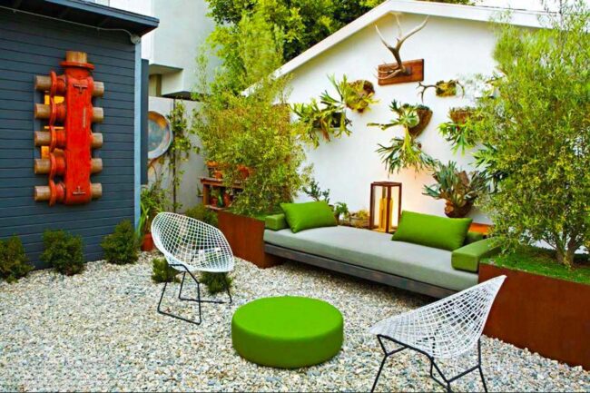 Gravel pathways weave through the space, offering tactile contrast against verdant greenery and complementing elegant metal sculptures that add artistic dimension.