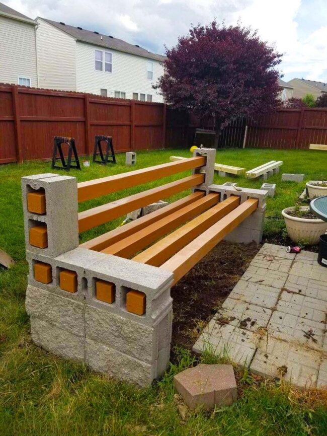 Concrete blocks provide a sturdy foundation for comfortable wooden planks, offering an affordable and stylish seating option for patios and backyard areas.