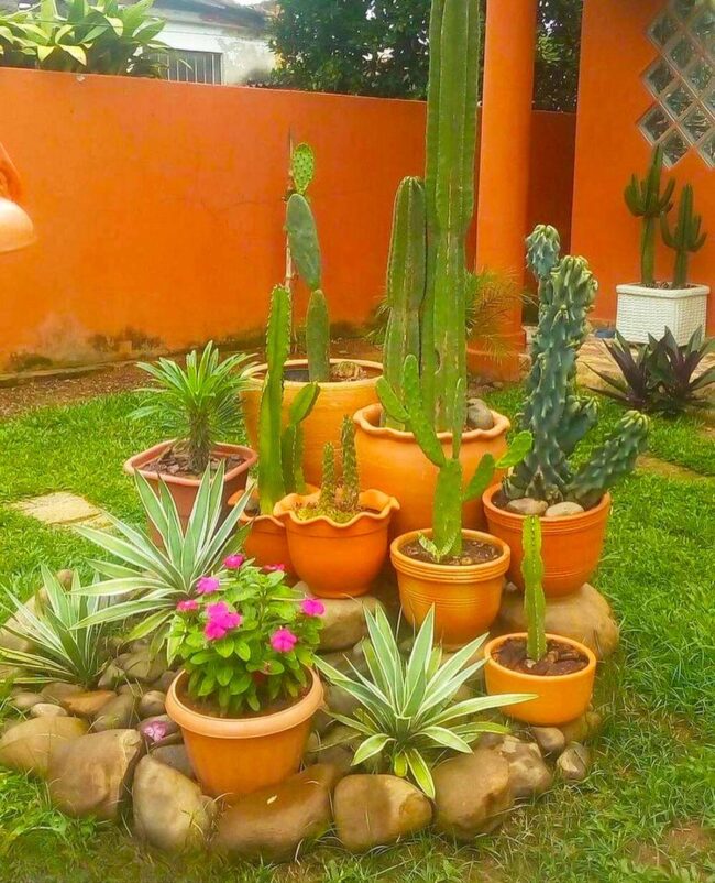 Desert gardens burst with charm when terracotta pots showcase an array of resilient cacti and succulents against striking orange walls.