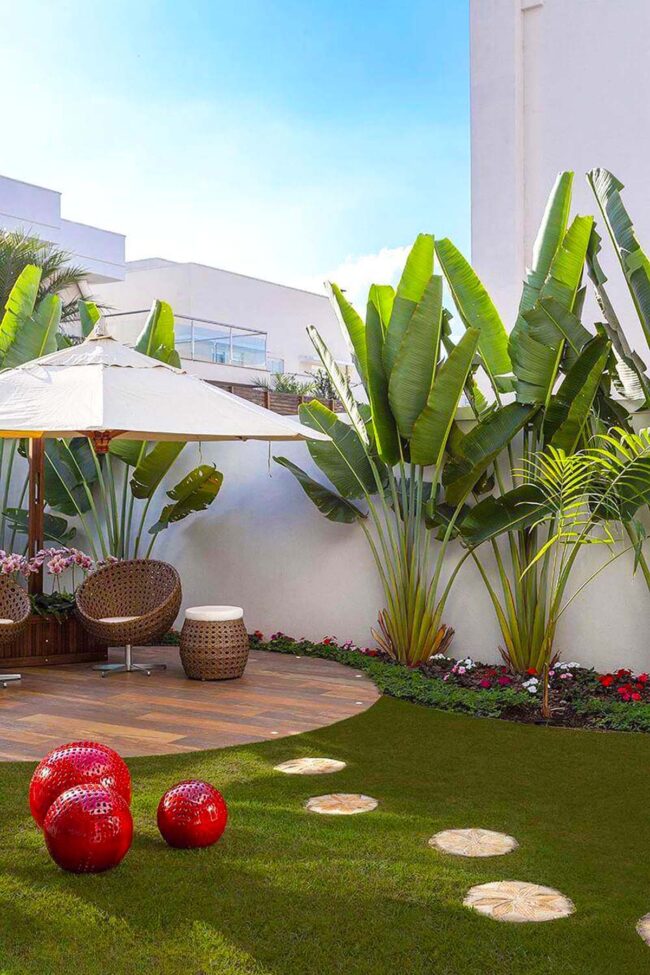 Tropical garden lounges create an intimate sanctuary where banana plants tower overhead, providing natural privacy around a warm wooden deck.