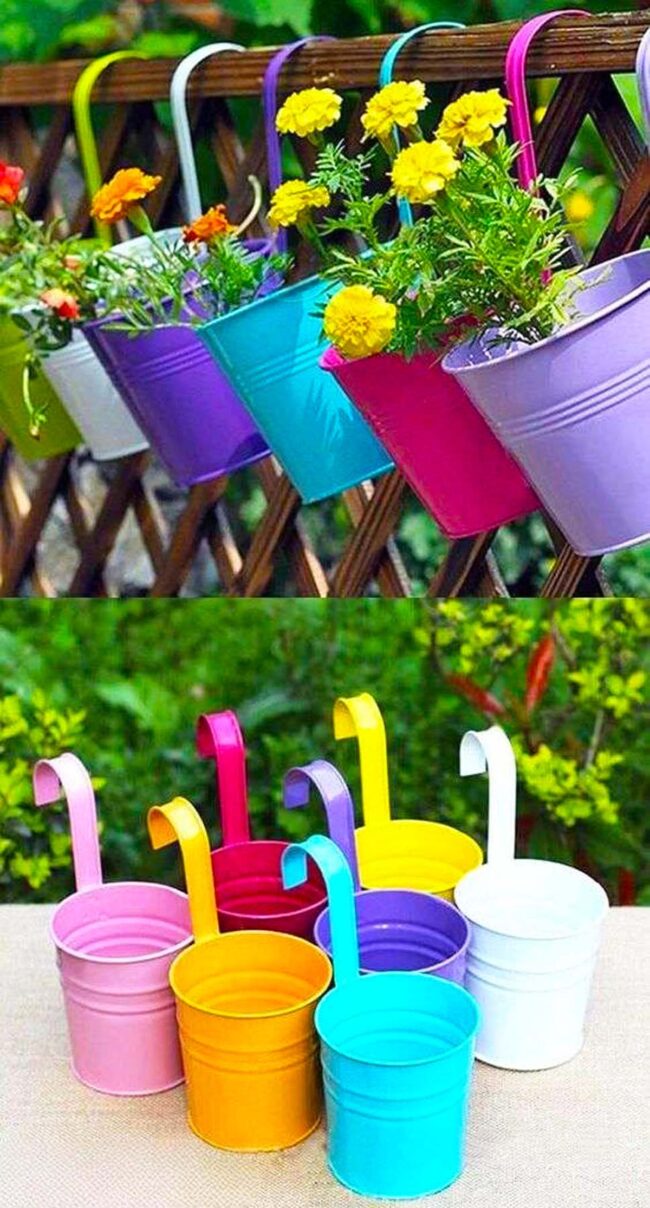 Repurposing metal buckets into charming garden planters brings unexpected delight to outdoor spaces, offering a creative solution for compact gardening.