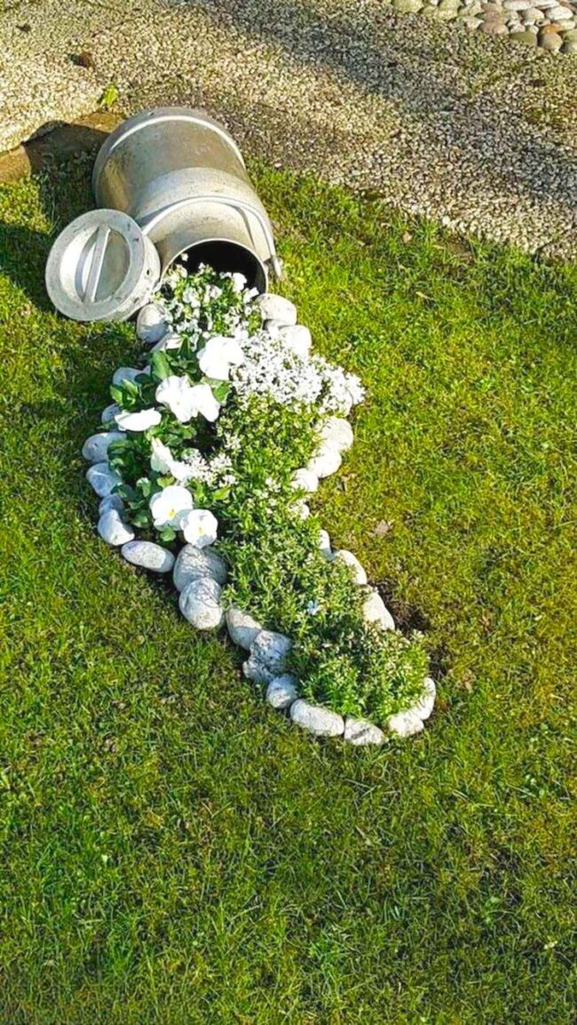 Garden magic springs to life with a cleverly positioned metal watering can tilted just so, creating a delightful illusion of accidental bloom spillage.