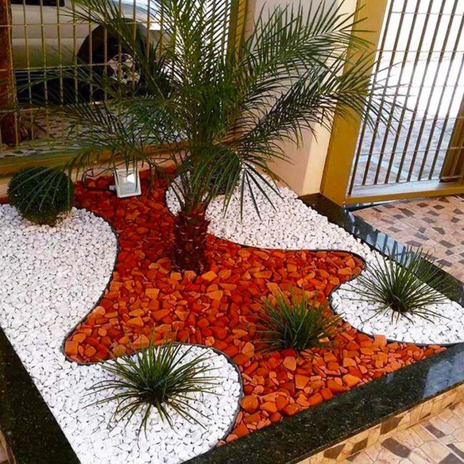 Striking terracotta and white stones weave a sophisticated visual narrative across carefully curated terrain.