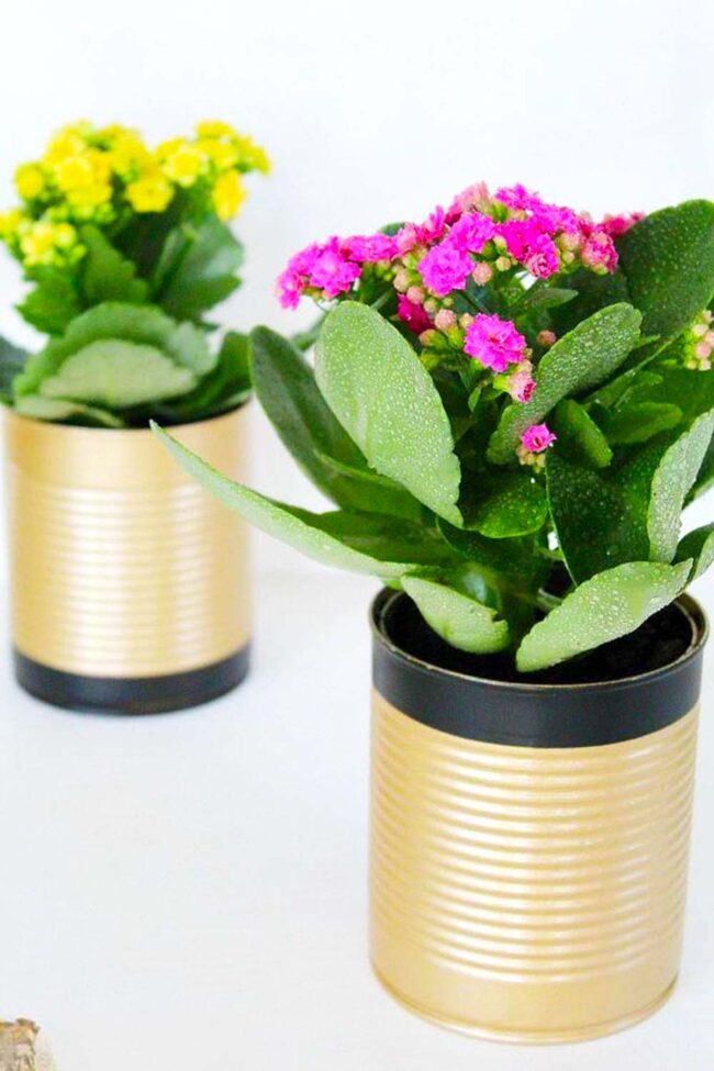 Kalanchoe plants with pink and yellow blossoms nestle inside these upcycled containers, transforming ordinary recycling into artistic garden decor.