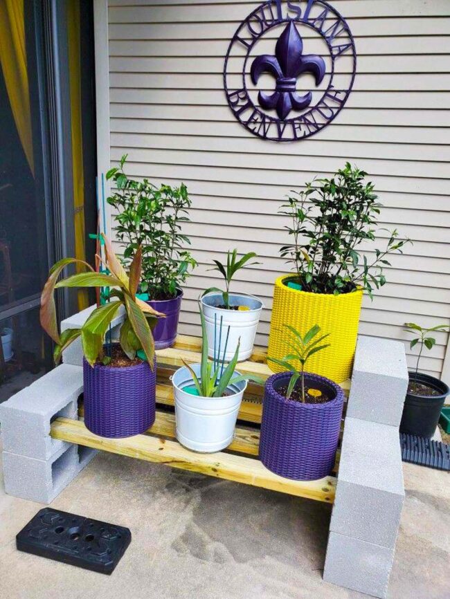 Colorful ceramic or terracotta planters nestled between concrete blocks bring delightful pops of yellow, purple, and green to the structure.