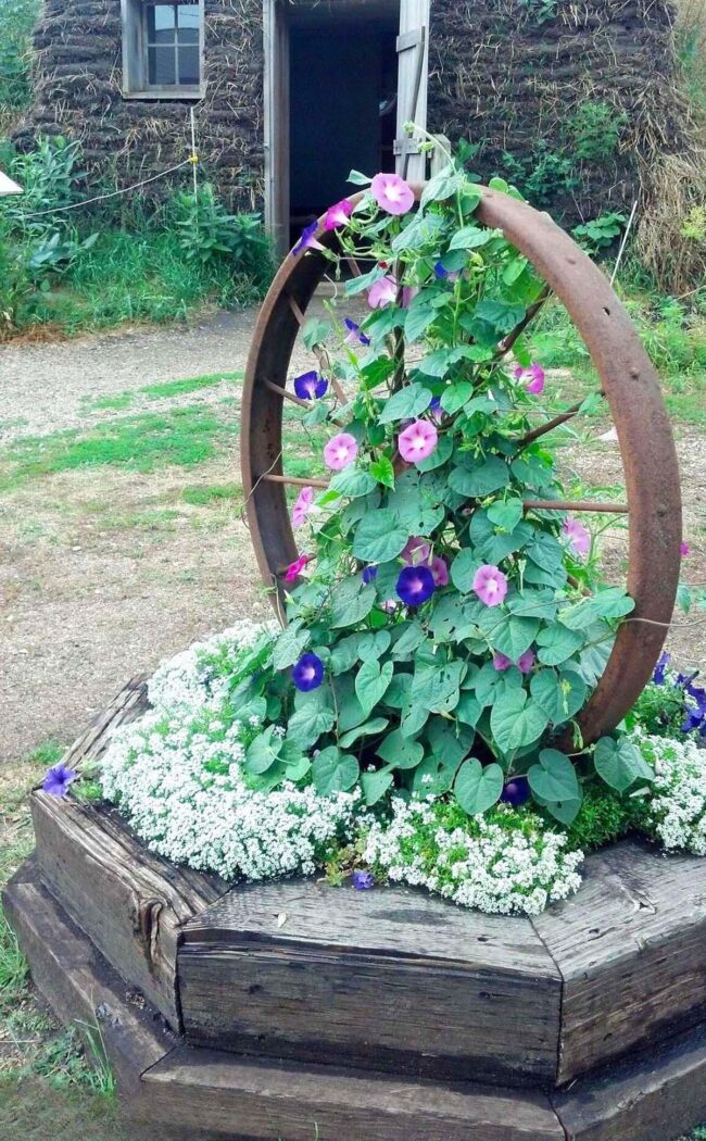 Delicate white Alyssum softens hardscape edges, providing elegant ground cover that complements the wheel's weathered texture.