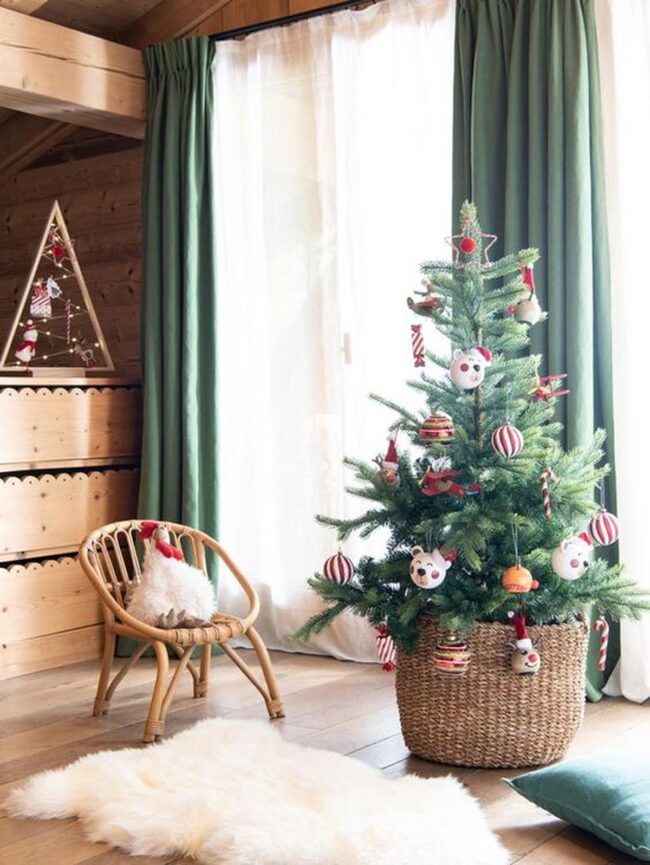 Wooden elements like the modest dresser anchor the room, crowned by a delightful miniature Christmas tree sprinkled with festive ornaments.