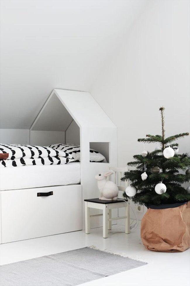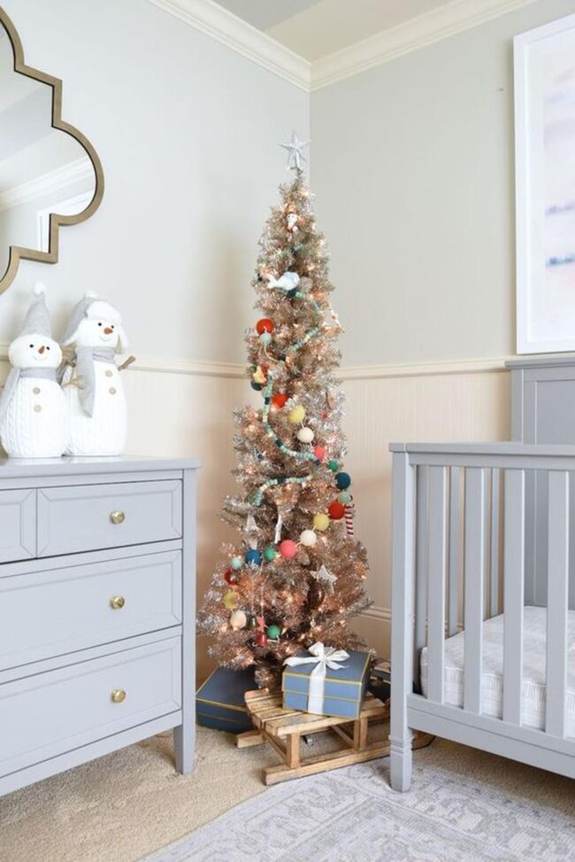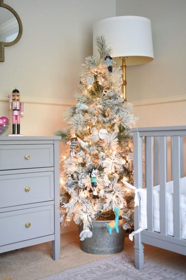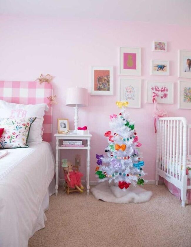 White furniture provides a clean backdrop for colorful accents like playful bows adorning a Christmas tree near a cozy crib.