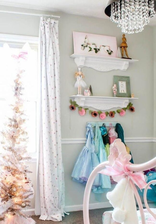 Soft pastel dresses become stunning wall art in this magical girl's bedroom, brightening ordinary walls into a whimsical display of childhood wonder.