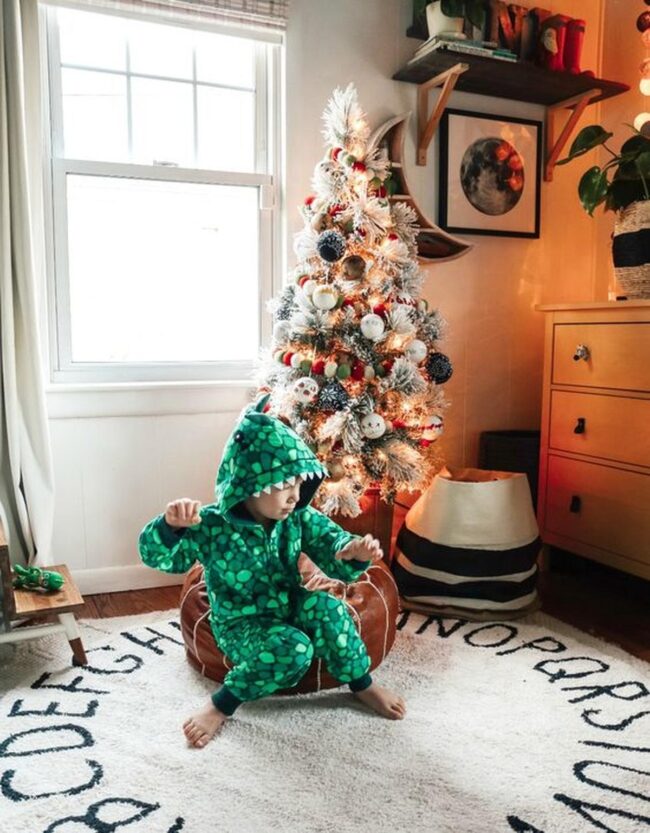 A charming little one nestled in a green dinosaur onesie brings instant personality to the space, while black letters circling the white rug add subtle educational charm.