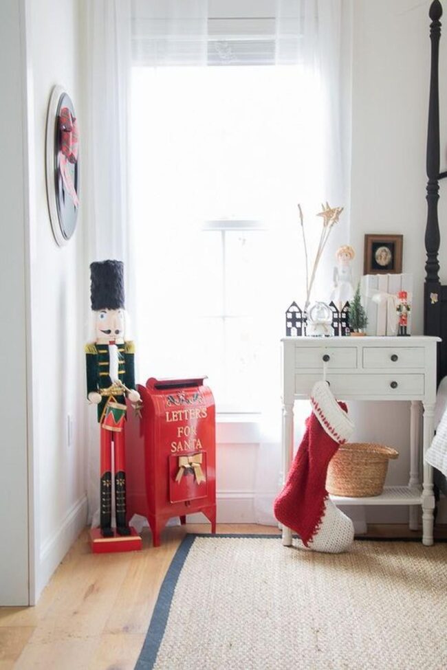 Holiday magic sparkles in this charming corner where a wooden nutcracker stands sentinel near a cheerful red mailbox for Santa's letters.