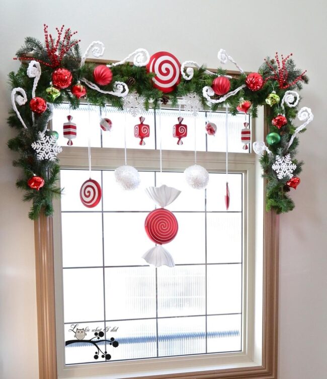 Sunlight streams through white curtains, highlighting delicate green wreaths that frame windows like nature's artwork.