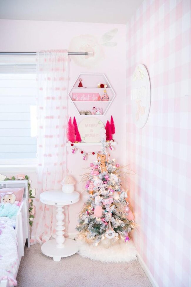 Soft pink and white checkered walls instantly spark joy, improving an ordinary space into a magical winter wonderland where every corner whispers happiness.