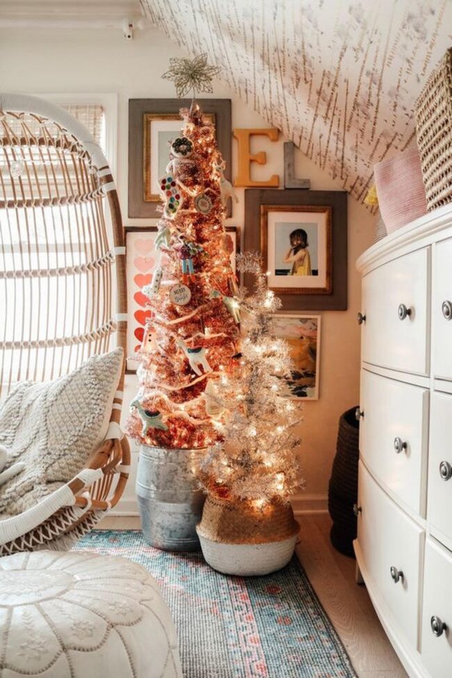 Soft white walls become magical canvases for sparkling Christmas trees decorated with unexpected blue and purple ornaments that catch every glimmer.