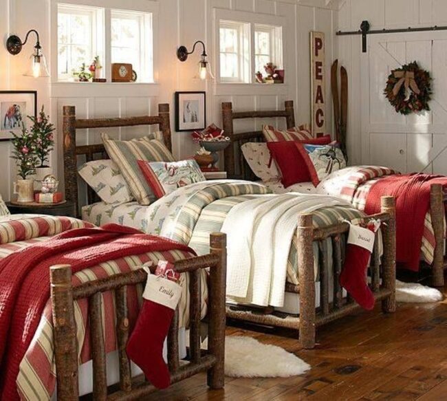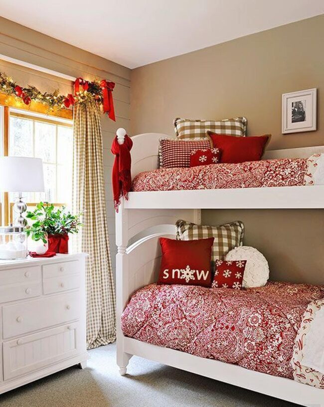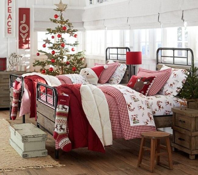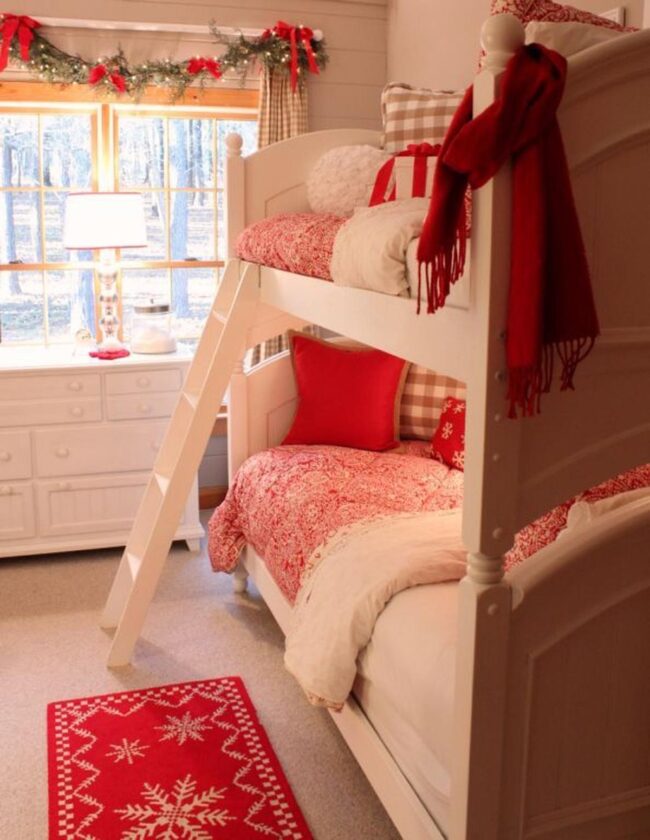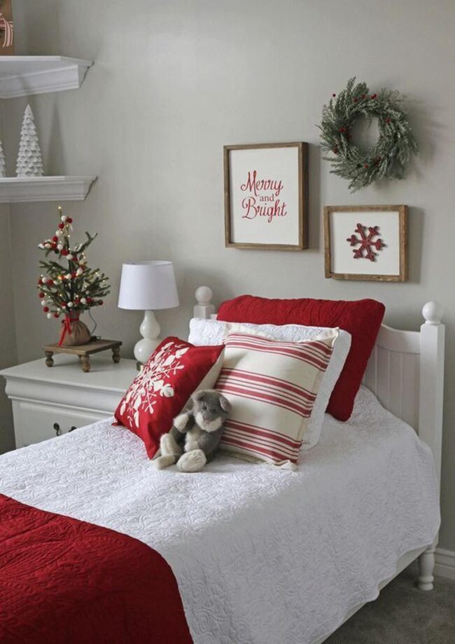 Holiday spirit dances through this cozy bedroom, where red and white colors blend with festive cheer.