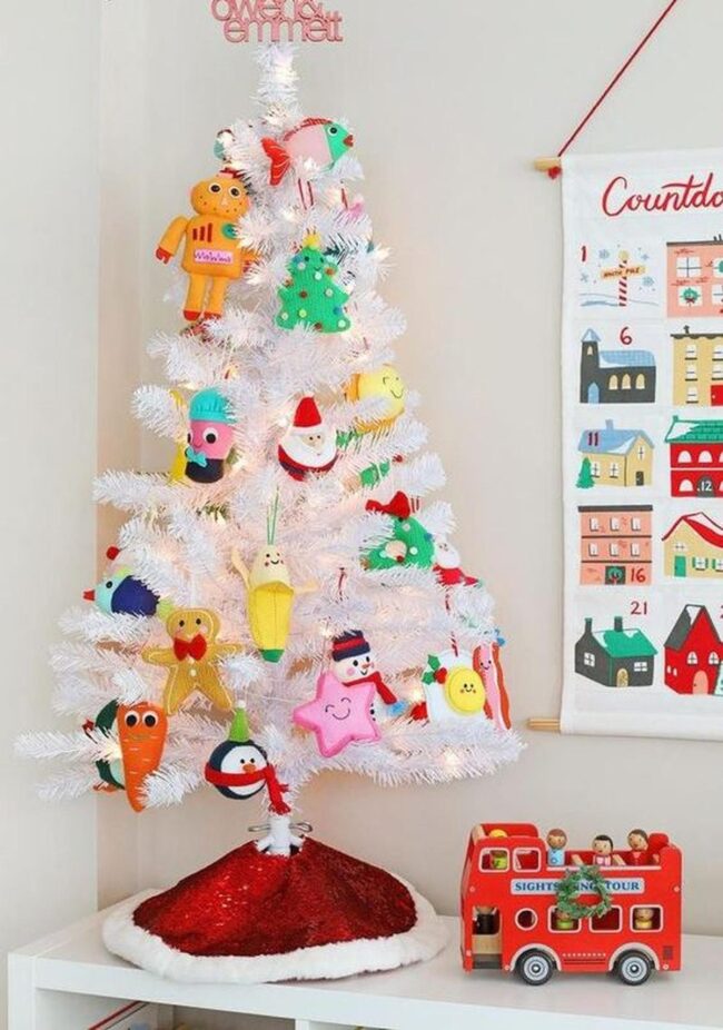 White Christmas magic sparkles through a charming holiday scene where delicate plush ornaments like adorable robots and whimsical carrots dangle from pristine branches.