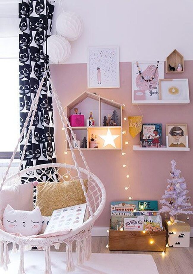 Soft pink walls welcome you into a dreamy sanctuary where a white hanging chair becomes the room's heart, adorned with charming tassels and adorable cat-themed pillows.