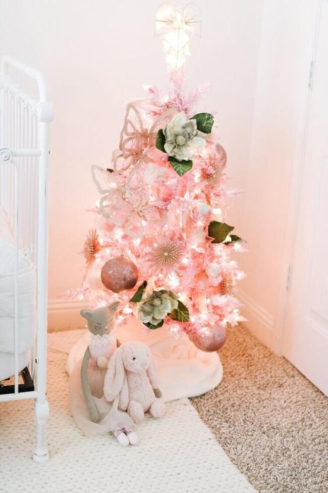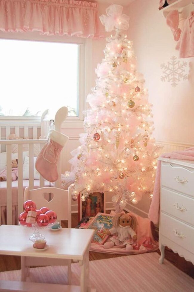Pure white plush rugs provide the perfect stage for a festive Christmas tree decked in pink and white ornaments that sparkle with whimsy and cheer.