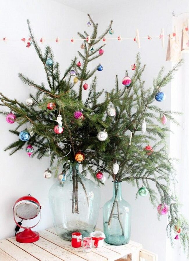 Glass containers showcase delicate green needles while dangling ornaments in red, blue, silver, and pink dance playfully around the branches.