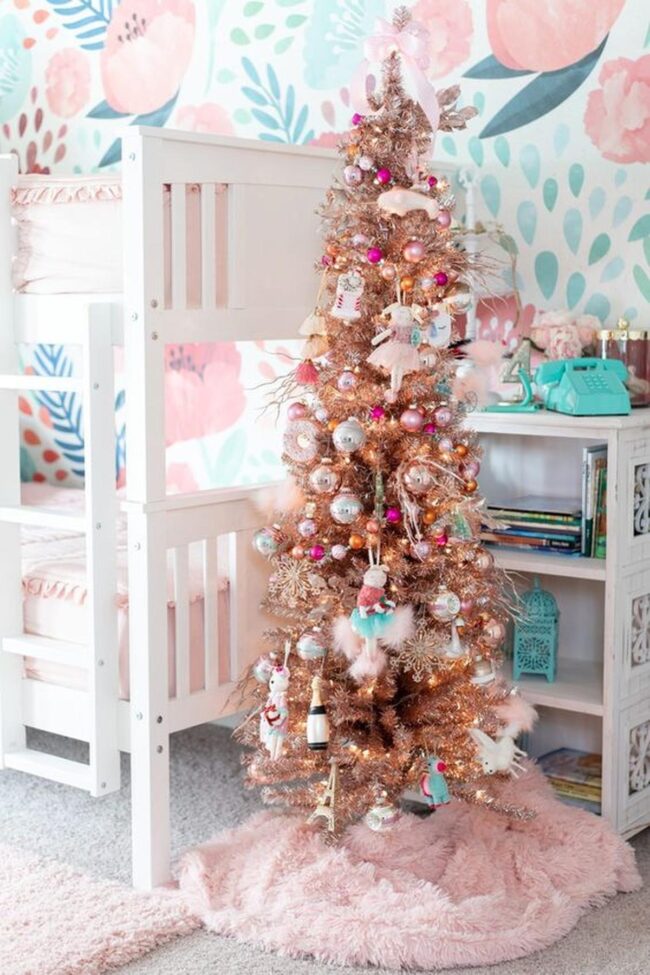 Soft pink and sky blue hues blend, creating a magical backdrop for charming details like a mini Christmas tree sparkling with whimsical ballerina and animal ornaments.
