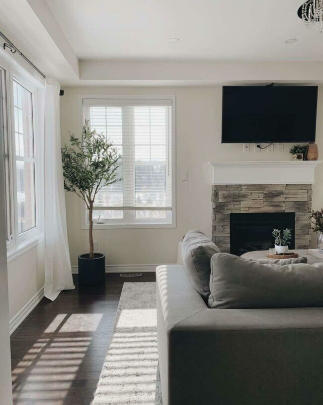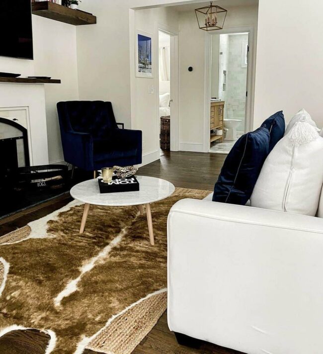 Casual throw pillows and textured rugs soften the space, making it feel welcoming and lived-in.