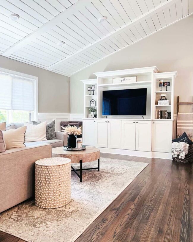 White shiplap ceilings dramatically elevate living spaces with their bold contrast against neutral walls.