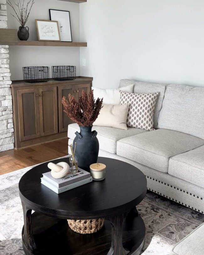 Nearby, a circular coffee table adds visual interest with its open bottom shelf, perfect for displaying cherished books or decorative items.